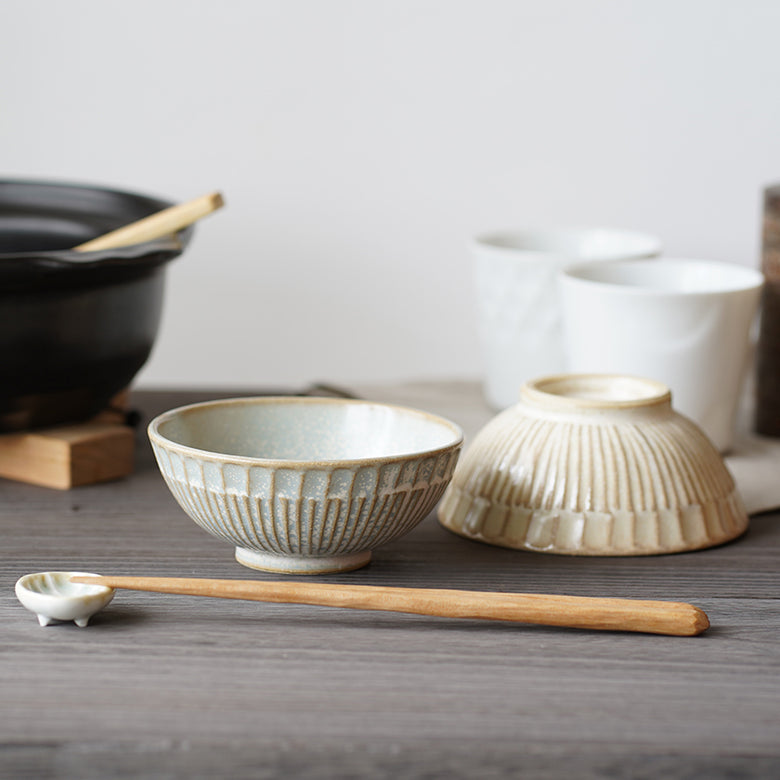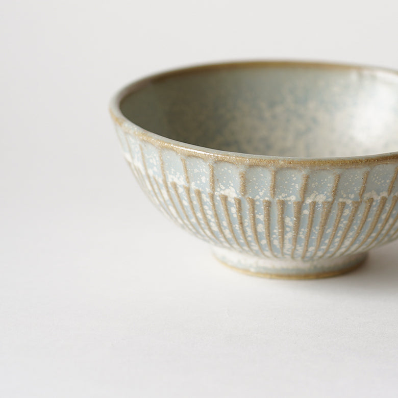 青色釉でコーティングされた茶碗は、爽やかな優しい水色。盛り付けたご飯の白を引き立て、一層美味しくみせてくれます。