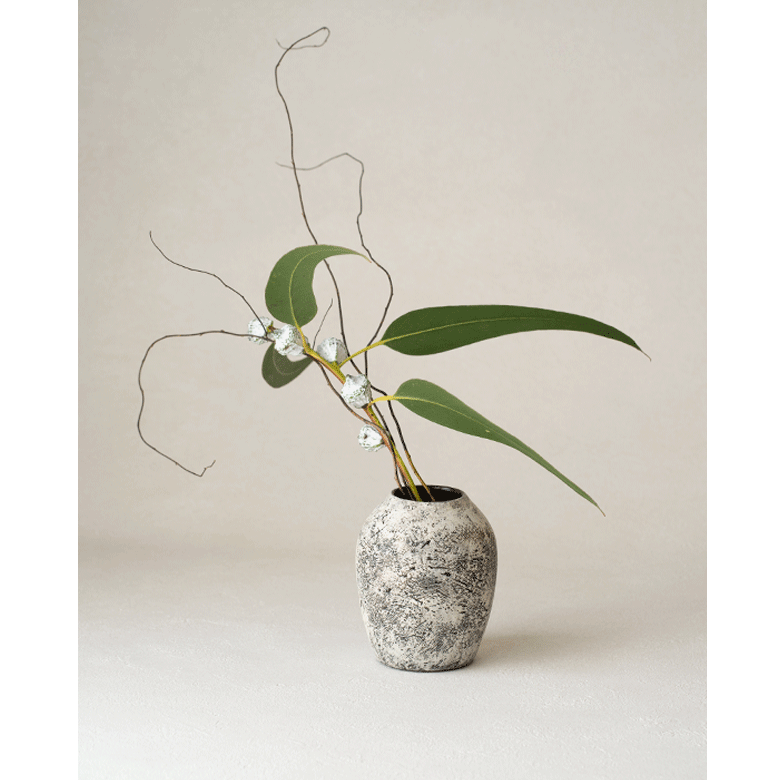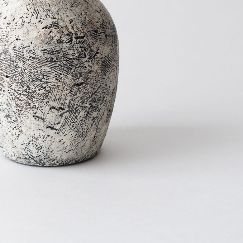 白黒の濃淡とランダムにのぞく櫛目模様の調和のとれた姿は、どこを前面に持ってきても、どの角度から見ても素晴らしく、無造作に置いてもサマになります。