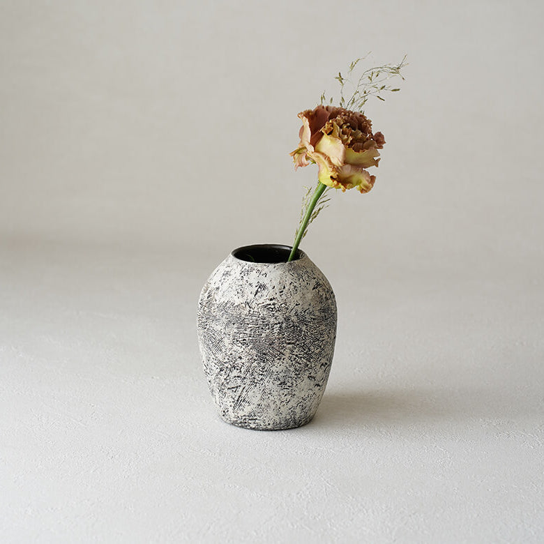 施された櫛目模様のシャープさと黒マット釉が相まってクールな印象を与えつつ、柔らかなフォルムで優しい印象も受ける櫛目花器。