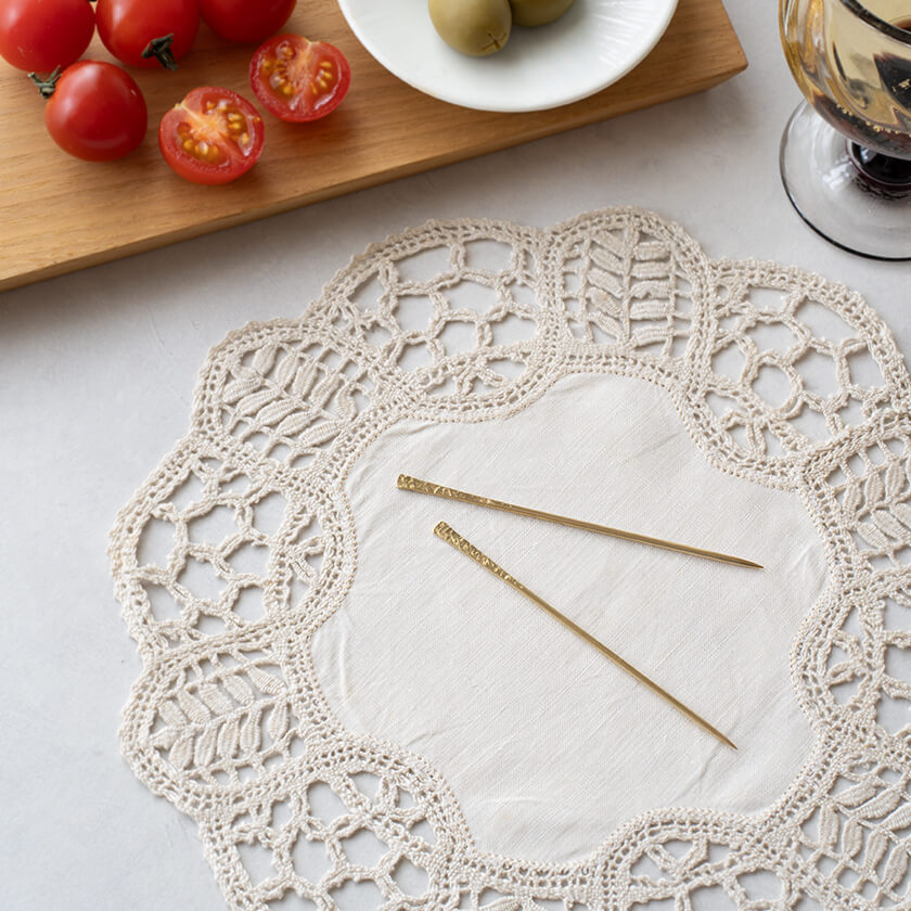シンプルなデザインはどんな器とも相性がよく、真鍮色はテーブルの素材にかかわらずしっくりと馴染みます。