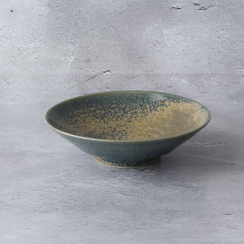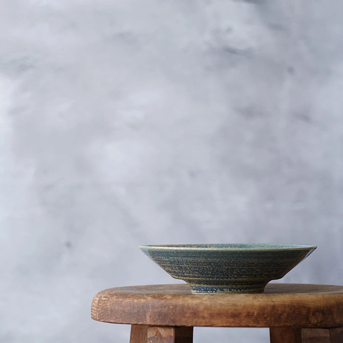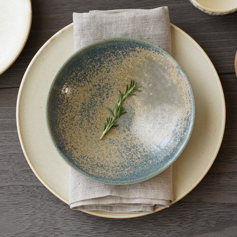 青色のうつわというと一見主張が強そうな印象をもちますが、Tamari窯さんのこちらの青色は、二重緑という藍染めにより藍と黄蘗を染め重ねた色に近く、それでいて淡く優しい印象を受ける絶妙な色合いです。