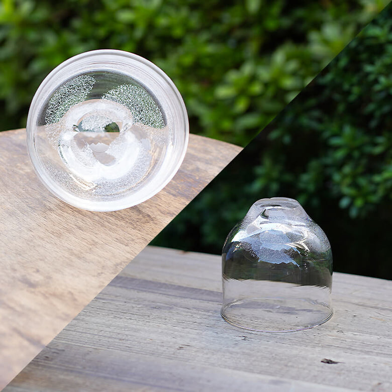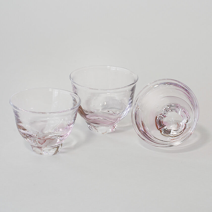 3枚の花びらのように形作られた底。そして、高台の厚みや高台から腰にかけてのなめらかな曲線により、グラスを覗くとはっきりとした輪郭の可愛らしい花びらが姿を見せてくれています。