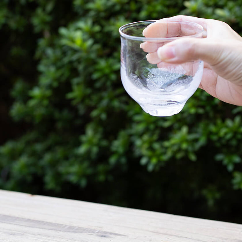 すっきりとした透明なガラスに白い砂の模様が美しい冷茶グラス。