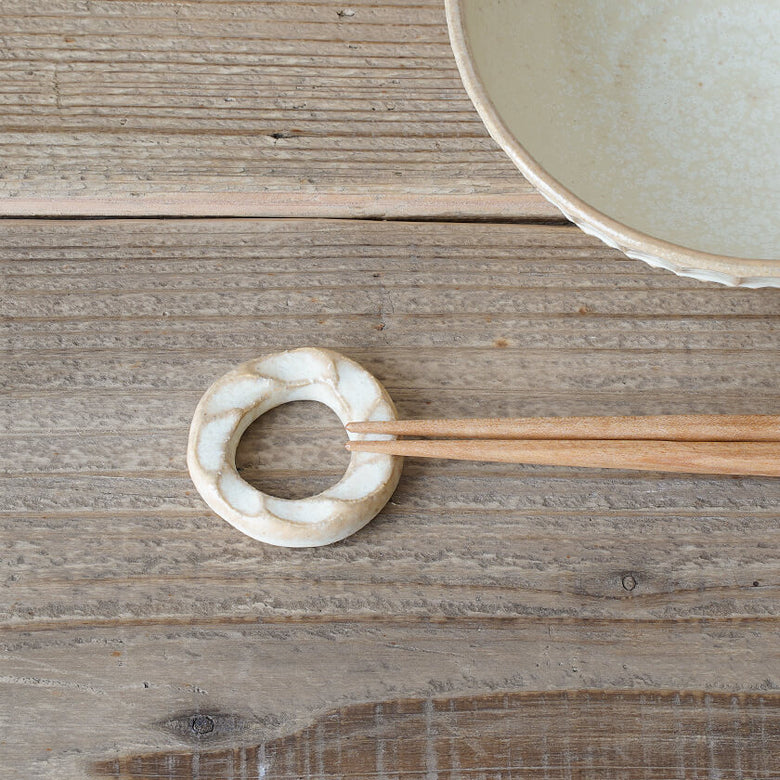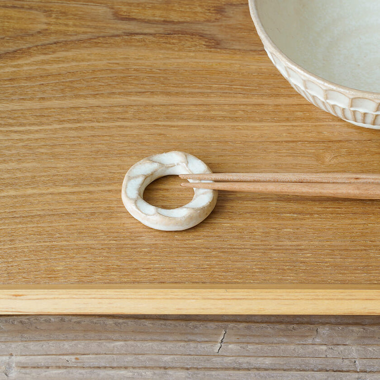 ドーナツ状の可愛らしい形に鎬(しのぎ)が施されたTamari窯 髙村 まりさんの箸置き。