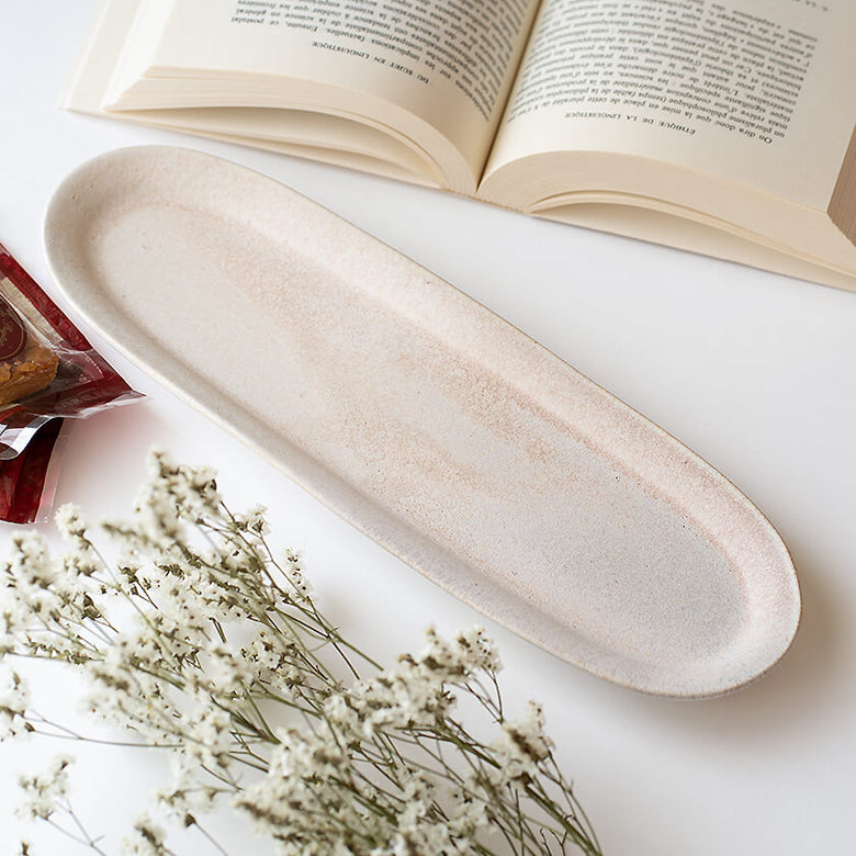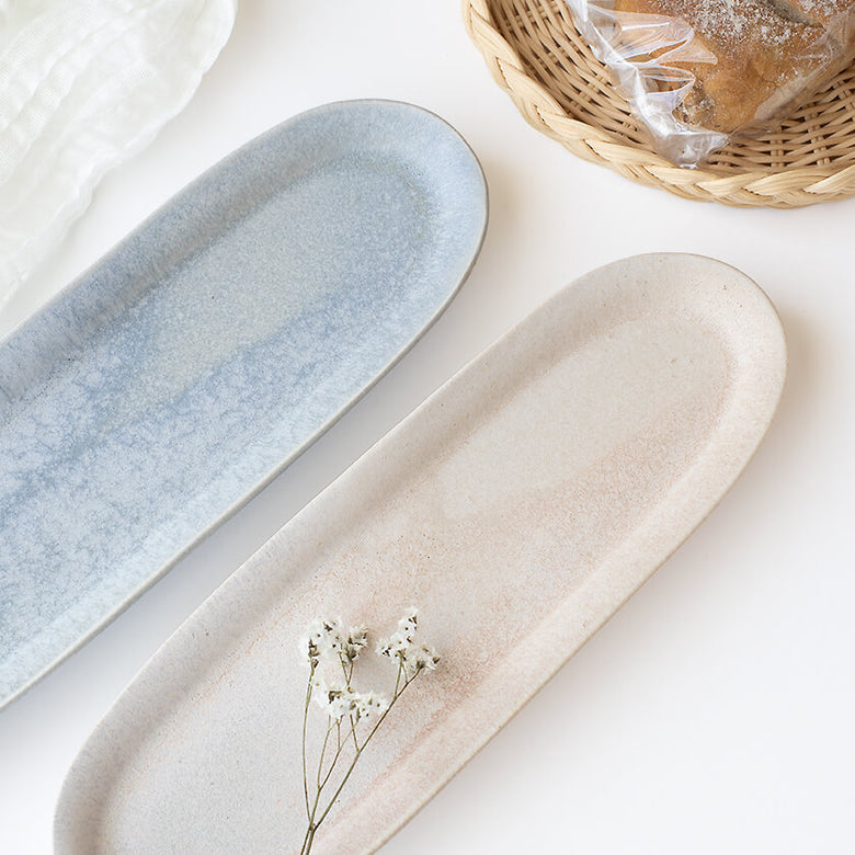 やわらかで落ち着きのある優しいピンク色の長皿。