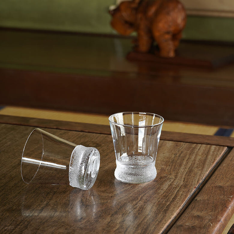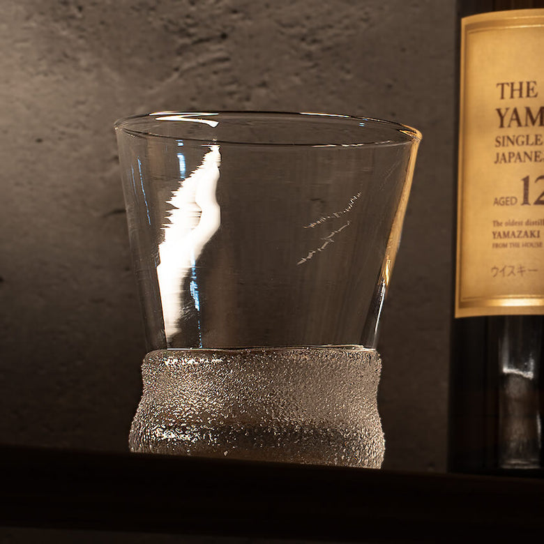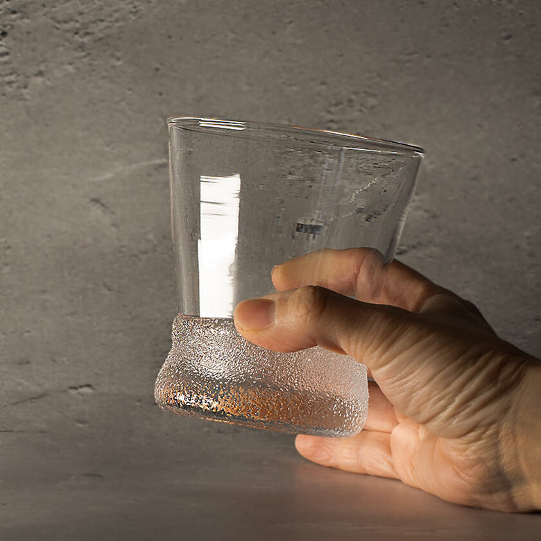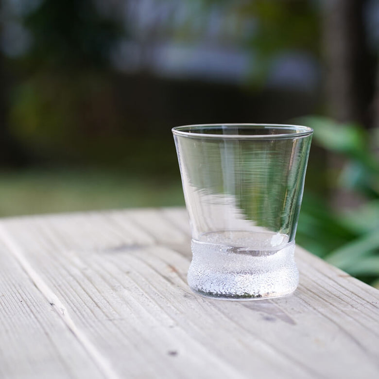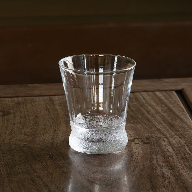 すっきりと澄んだグラスの底辺にガラスの粒があしらわれた250ml入るたっぷりサイズのロックグラス