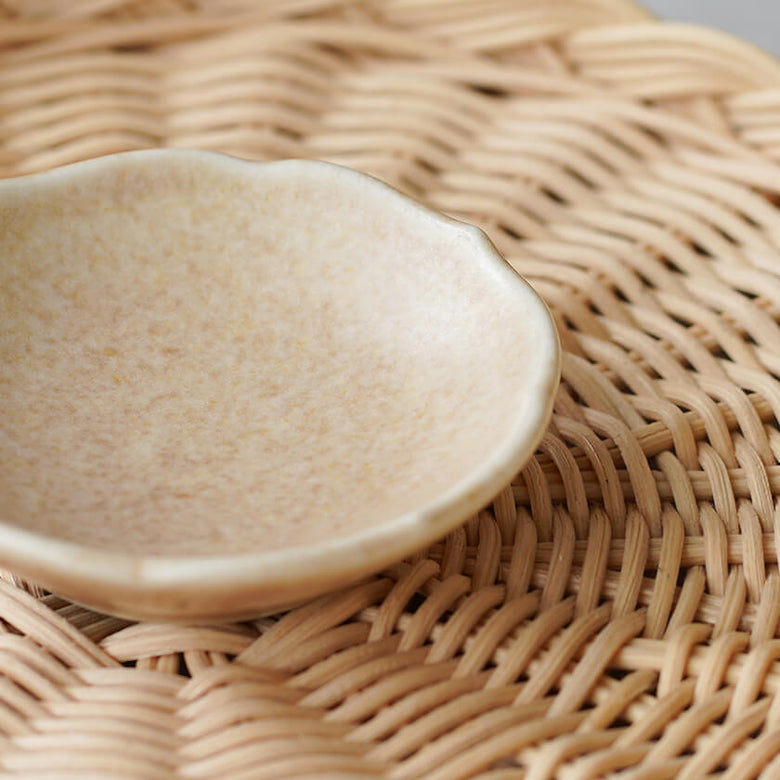 ふっくらと可愛いフォルムに、さりげなくツンと入った稜花のフチがアクセントになった豆皿です。