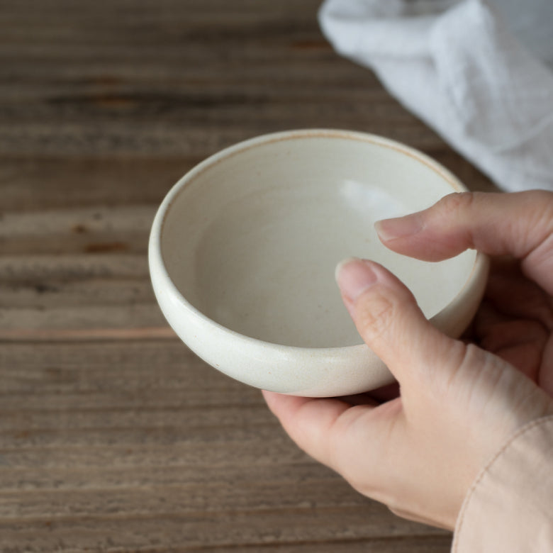 ふわっと内側にすぼまった縁がやさしく影を落とし、全体に柔らかな印象を与える丸小鉢。