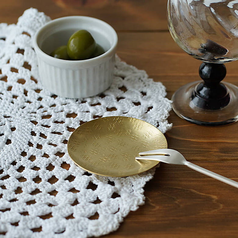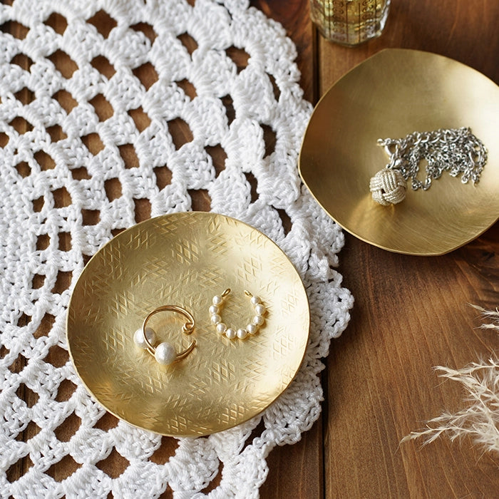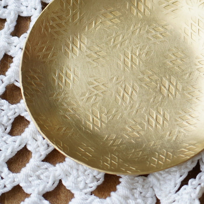 真鍮板を切り出し、木槌や金鎚でひとつひとつ手作業で叩いて制作されているこちらのミニトレイ。