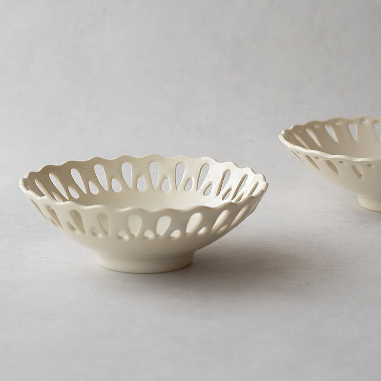 波打つフチと大きく施された透かし彫りの模様は、印象的な造形を生み出し、通り抜けた光によって映し出された影は、食卓に華やかさと奥行をもたらしてくれます。