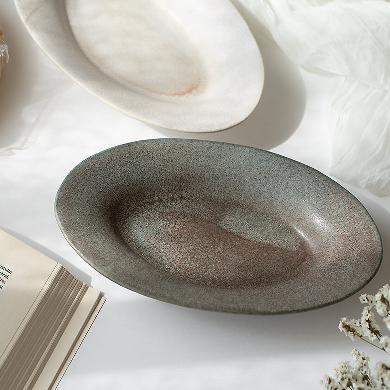 黒っぽい表面に赤みを帯びたグラデーションがなんともカッコイイ、黒紺のオーバルプレート。