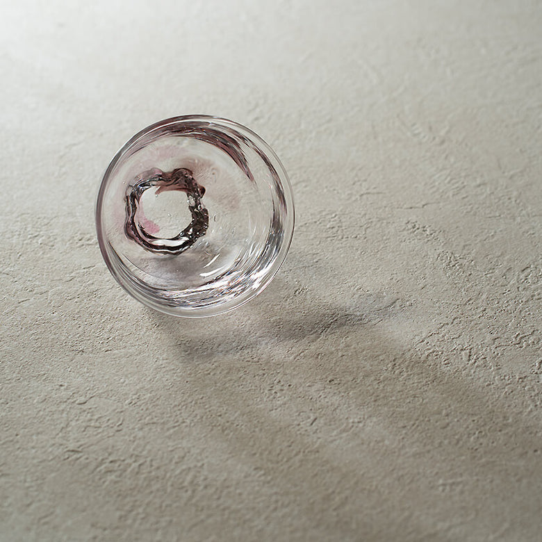「風紋」の名前の通り柔らかな赤と深い赤(赤紫色)、黒が底から風に舞ったかのようにふわりとグラデーションをまといグラス全体がほんのり桜色の美しい酒器。 高さ5.5cm 口径 6cmととても小ぶりな、おちょこサイズです。