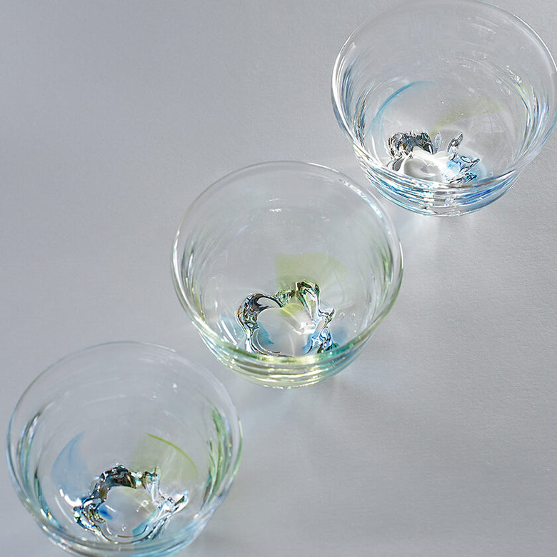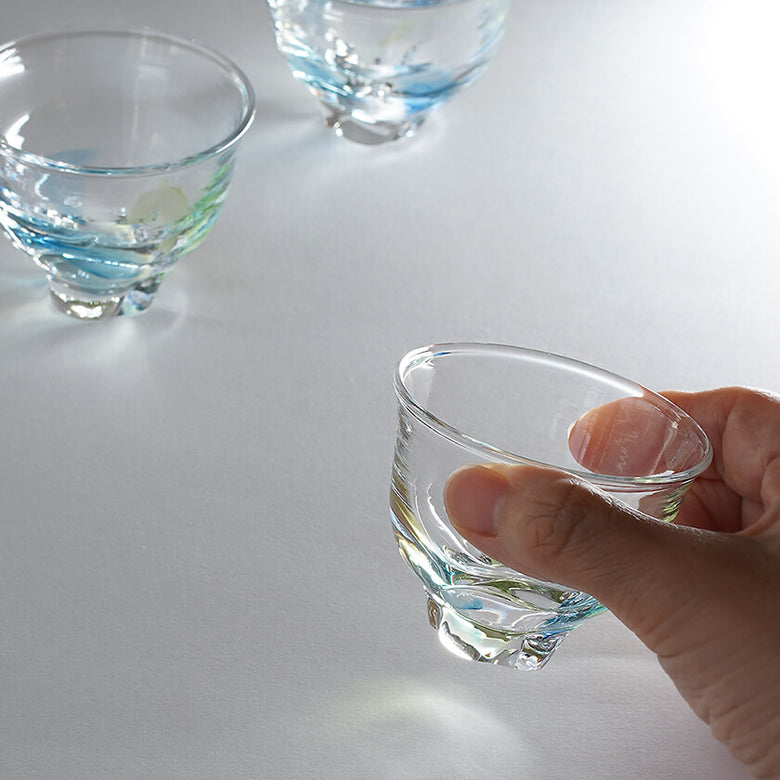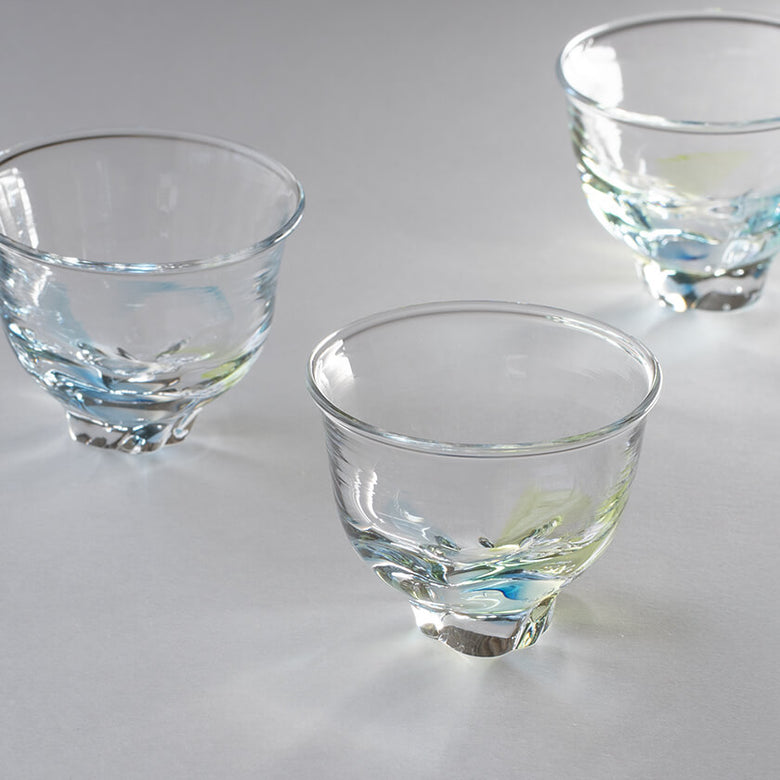 酒器の底に、ふわりと広がる色ガラスは、一度膨らませた色ガラスを常温で冷ますことによって、自然に割れた破片をひとつひとつ、無色透明なガラスの先端に付けて生まれたもの。