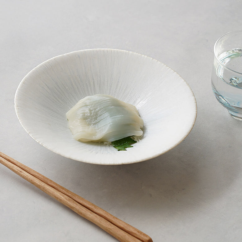 淡く施された灰青のしのぎ模様が食材の彩りをやさしく引き立ててくれます。
