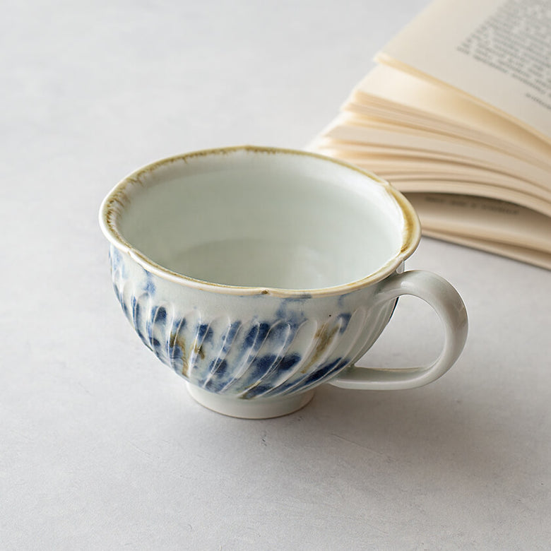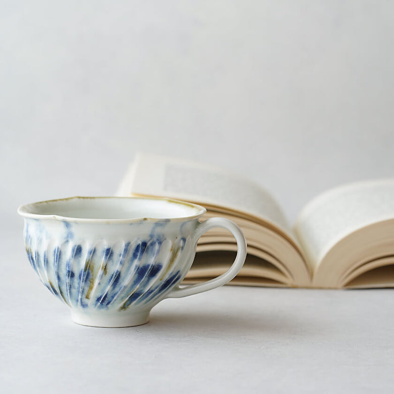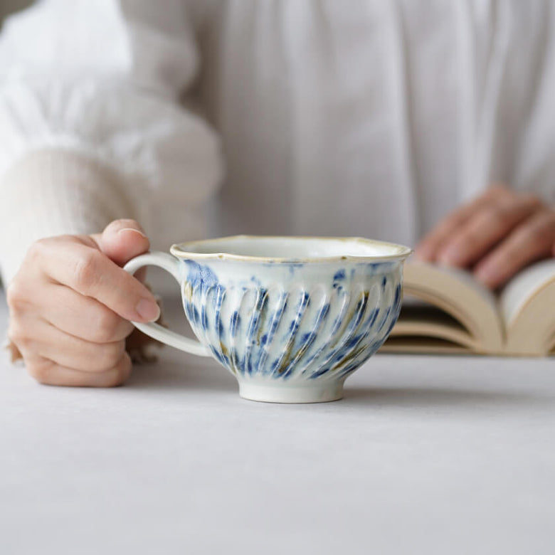 輪花のデザインが施されている口元は、カップを口に運ぶ度にふと目に入り、ほっこりと優しい気持ちに。