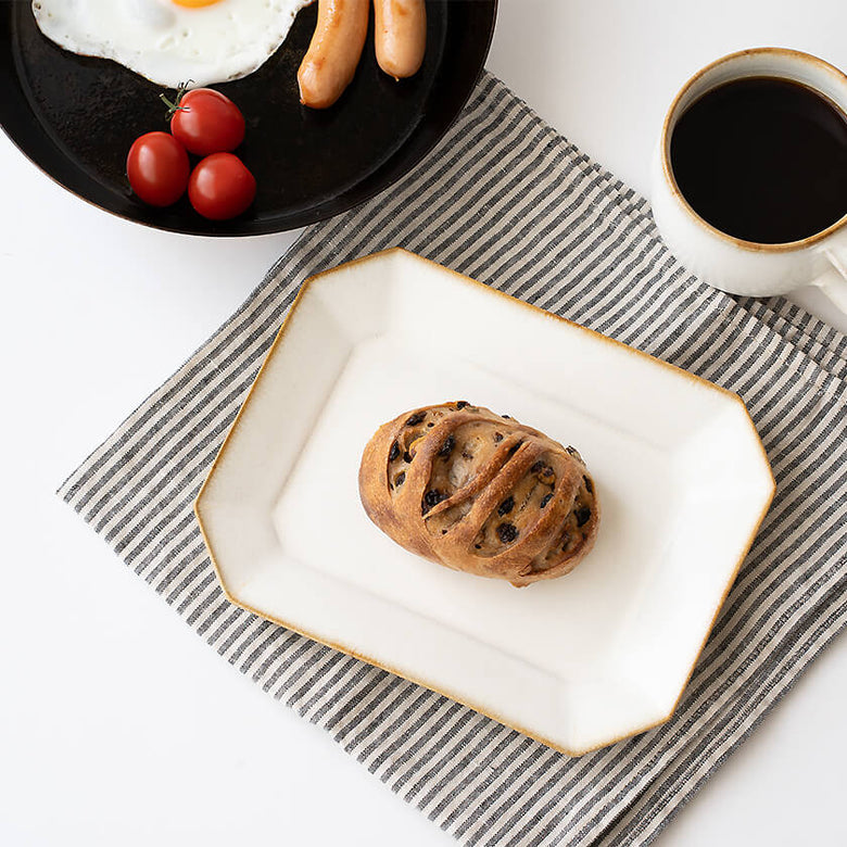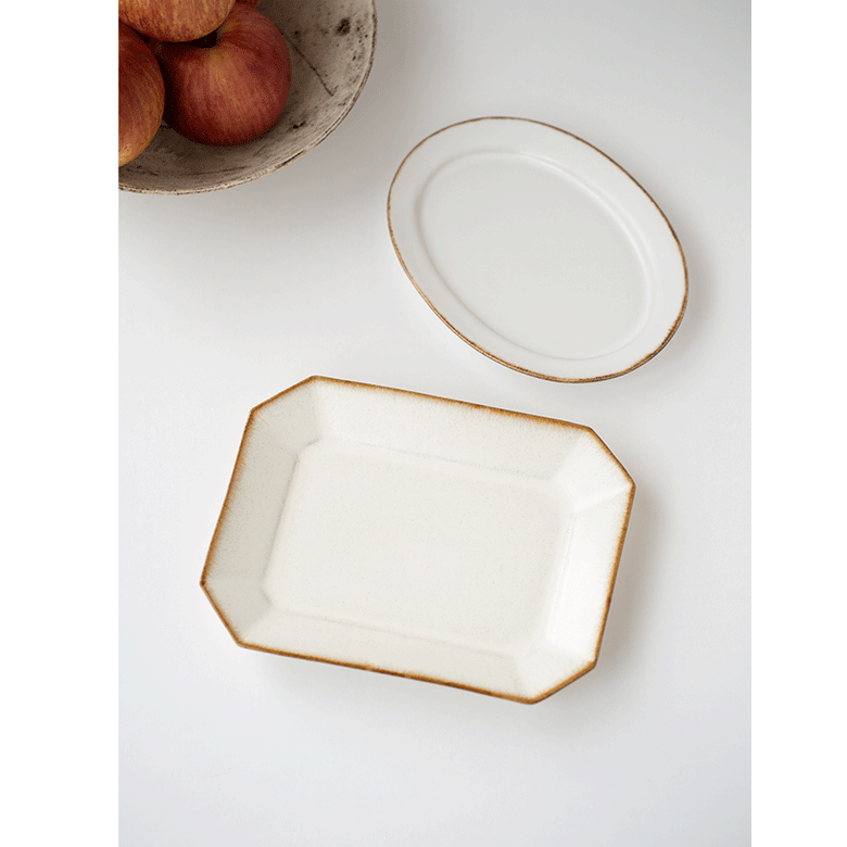 乳白色の色味と明るめの茶色のフチが柔らかな印象を与える隅切り皿。