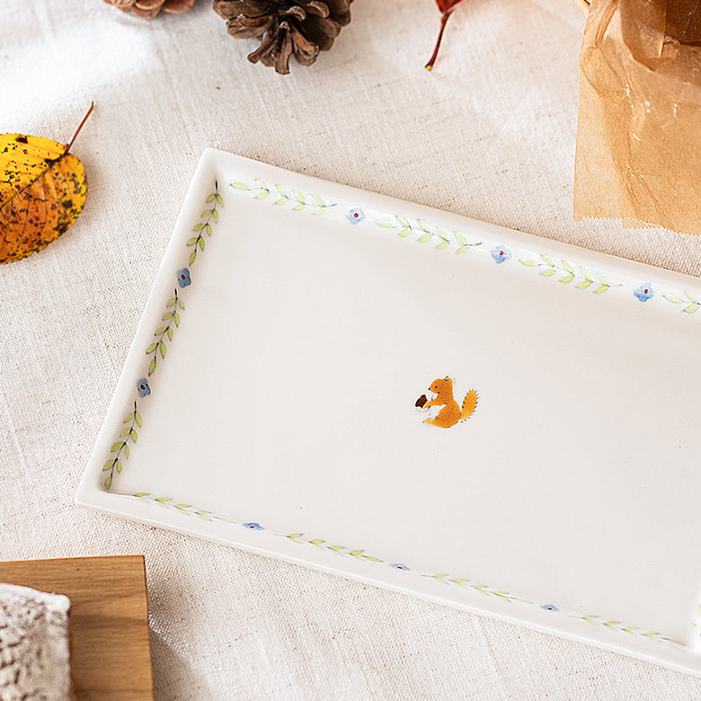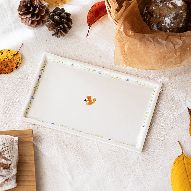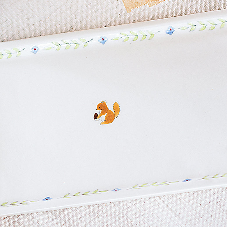 真ん中にちょこんと描かれた、まるで絵本から飛び出してきたかのような栗を持ったリスが愛らしい長方形プレート。