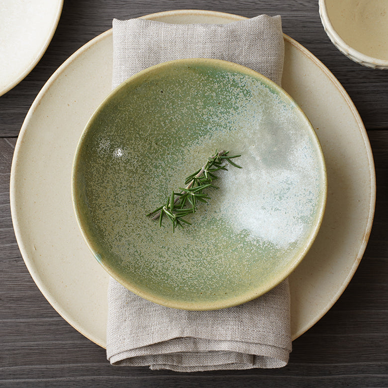 緑色のうつわは、大根やジャガイモ、ニンジンといった根菜類の色と相性がよく、落ち着いた色ながらも渋すぎない柔らかなTamari窯さんの緑は、食卓の様式に関わらず、すっと馴染み彩を添えてくれます。