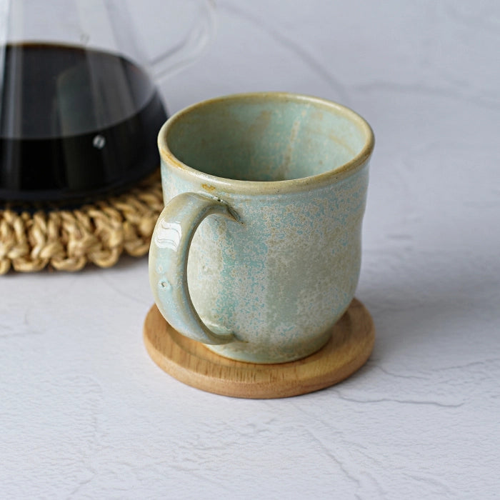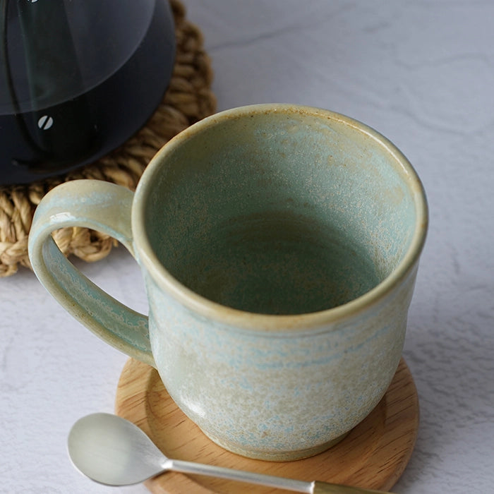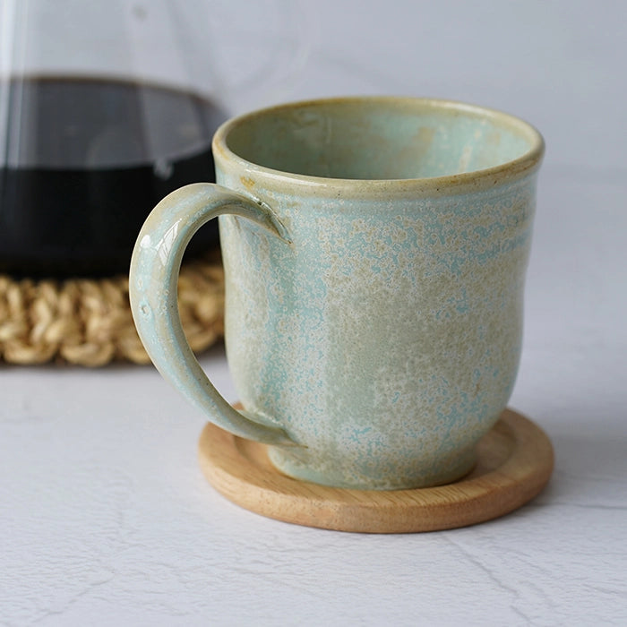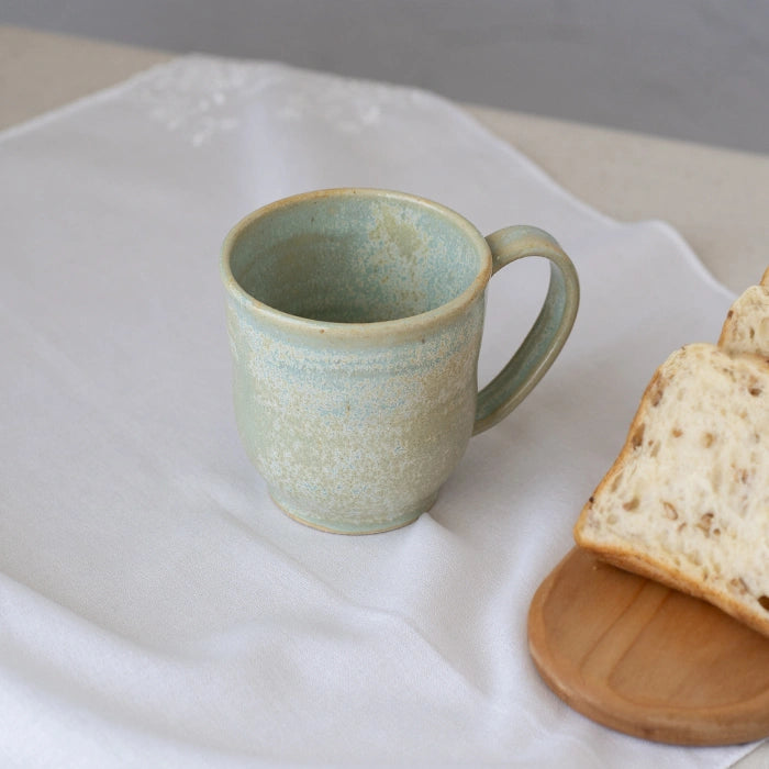 陶器本来の質感と釉薬の柔らかいライトグリーンが相まってふんわりとした雰囲気を纏い、朝の一杯を優しく引きたててくれます。