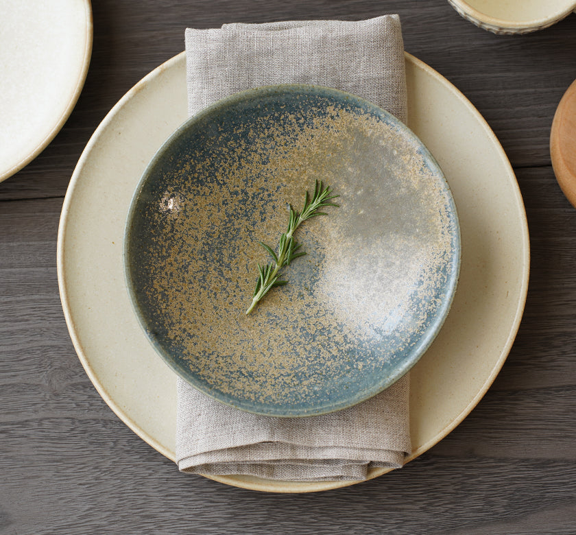 一度目に塗られた釉薬の上から重ねて塗られた結晶釉は、うつわに豊かな表情を与え、置く方向や眺める角度によって、様々な表情が楽しめます。