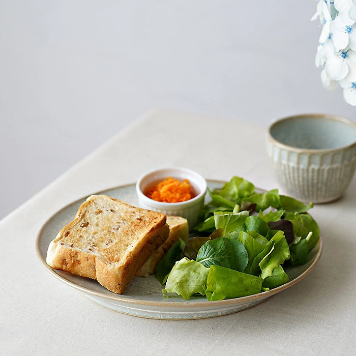 青色釉でコーティングされたソーサーは、淡い水色の爽やかな色合い。所々にのぞく白色が爽やかさをさらに引き立てています。