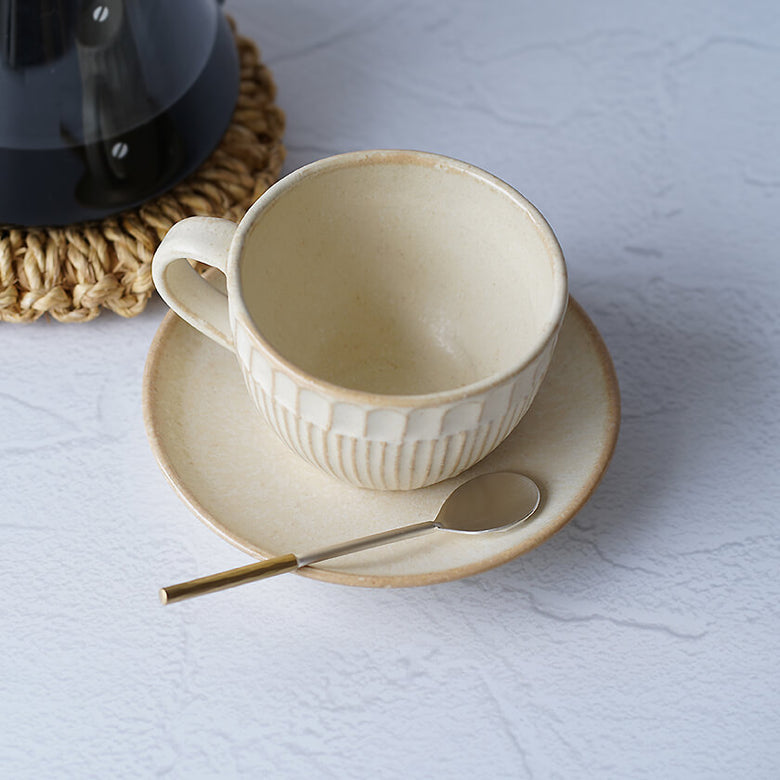 シンプルでありながら、カップを包み込む温かさと包容力を感じる緩く窪んでいる造形は、手を添えやすく、ソーサーごと持ち上げる際にもスムーズに口元まで運ぶことができます。