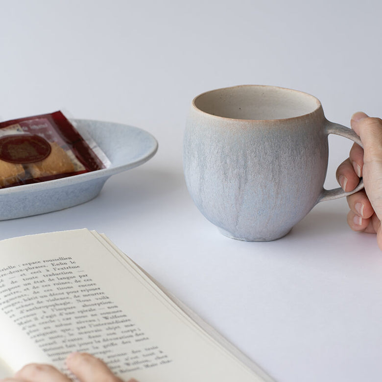 やわらかな水色が爽やかな「青」の樽型マグ。