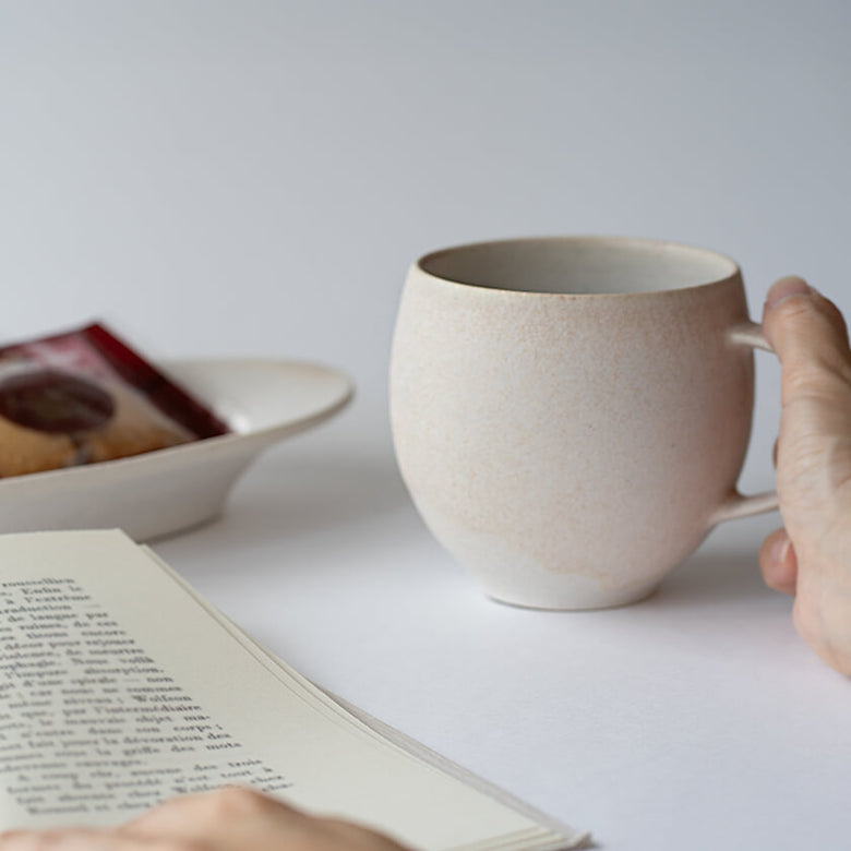 やわらかなピンク色が可愛らしい「白」の樽型マグ。
