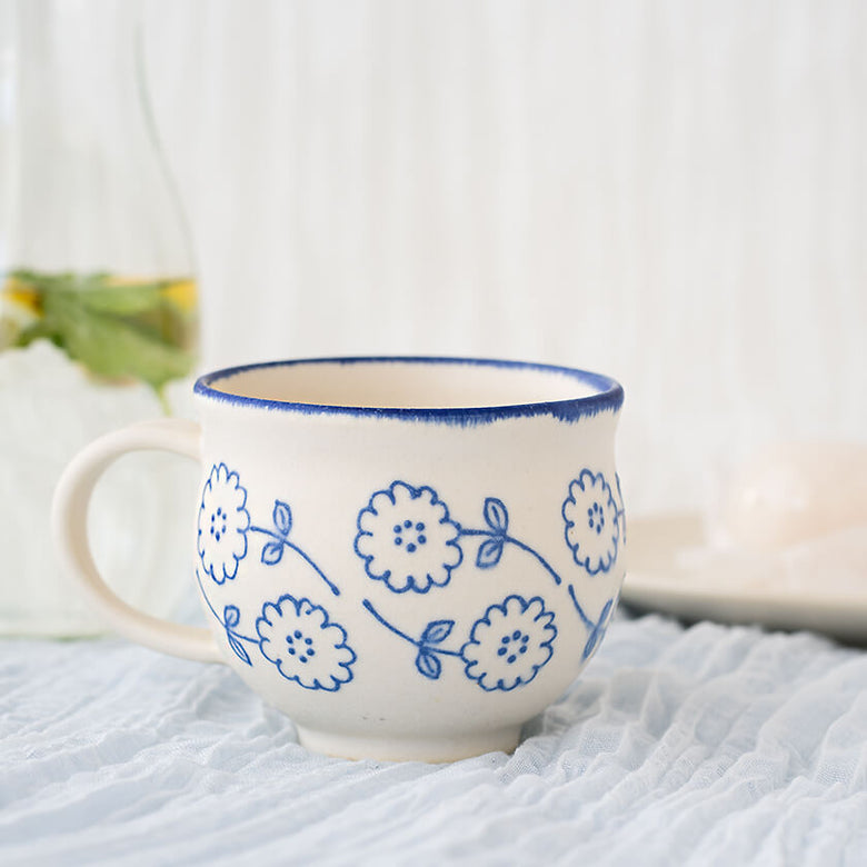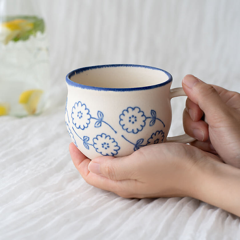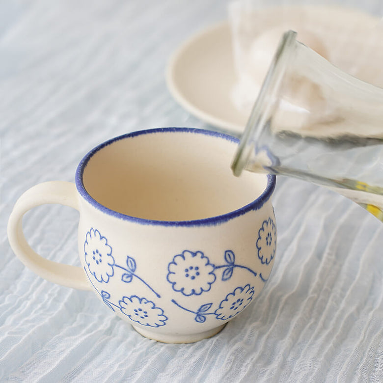 青色で描かれたこちらのマグカップは、夏らしい真っ青な空の下、元気いっぱいに咲くお花たちの姿が思い浮かぶような、明るく涼やかな作品です。