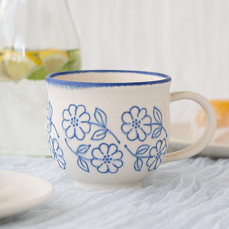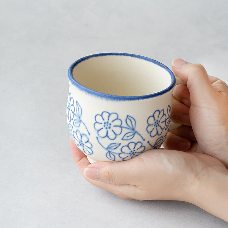 青色で描かれたこちらのマグカップは、夏らしい真っ青な空の下、元気いっぱいに咲くお花たちの姿が思い浮かぶような、明るく涼やかな作品です。