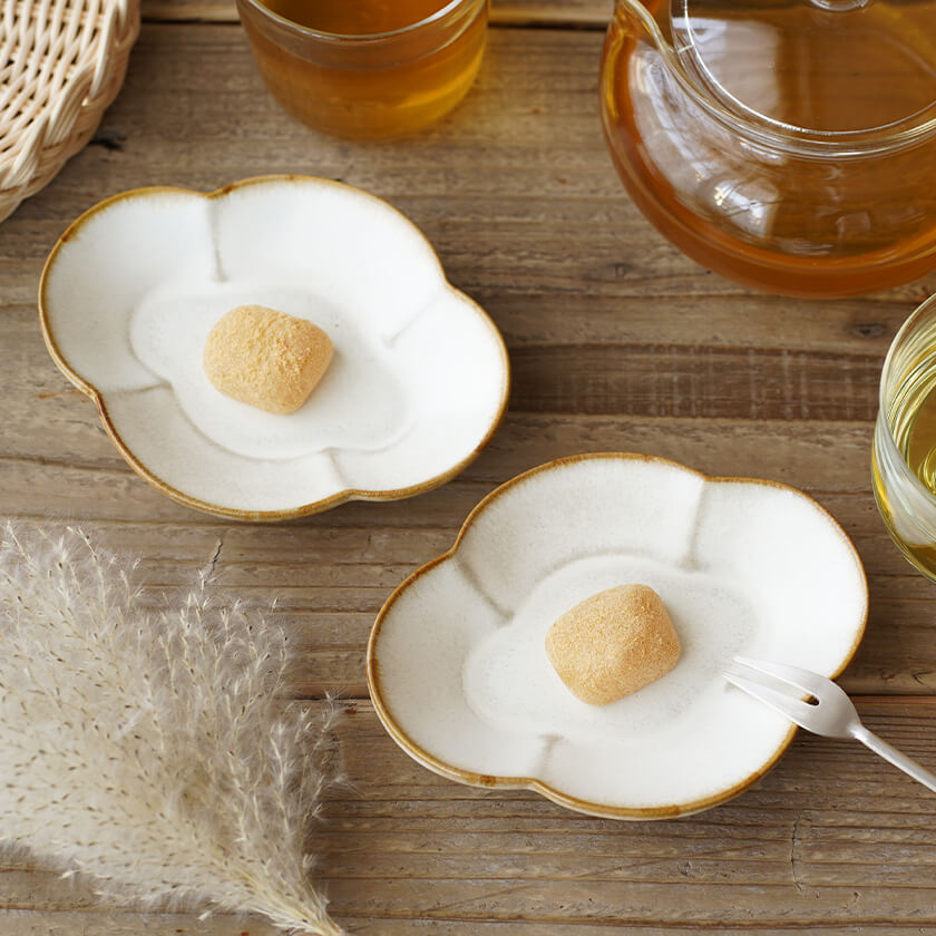 しっとり乳白色の木瓜小皿や八角浅鉢とは異なる質感で、艶がありつるつるとした質感です。